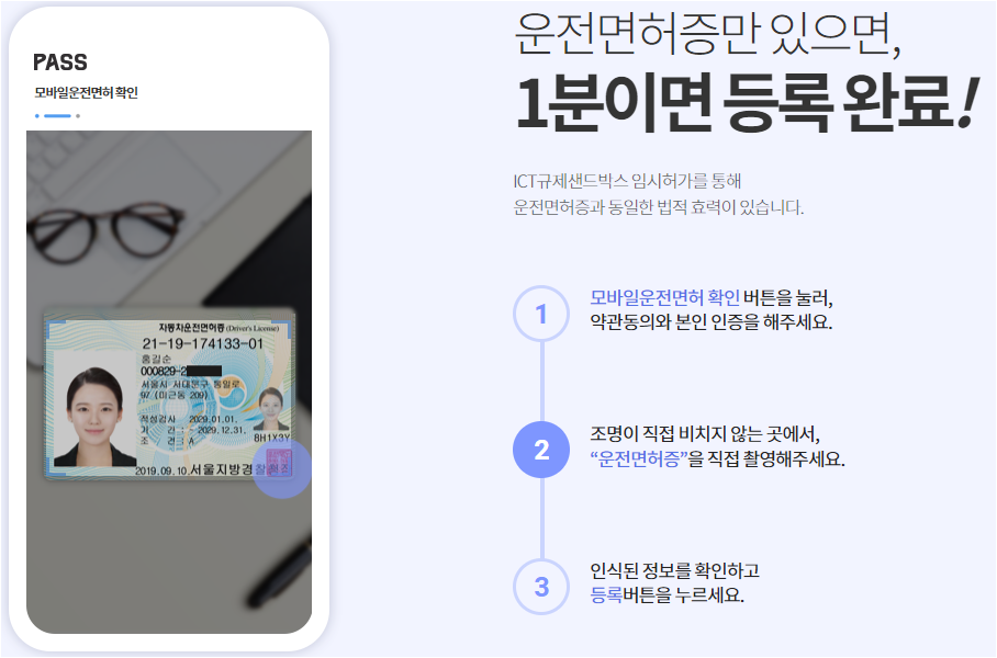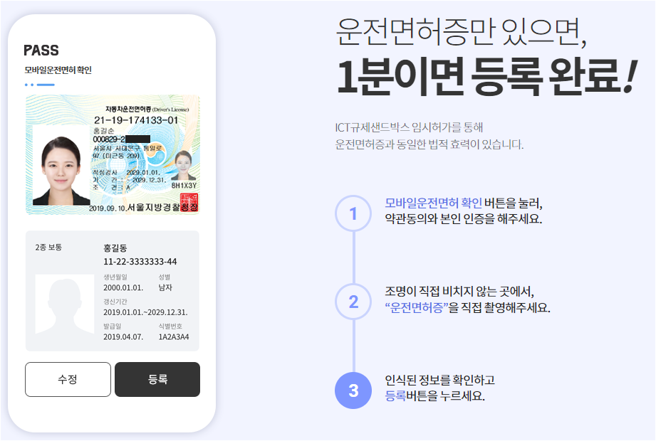 PASS 앱을 통해 모바일 운전면허증을 등록하면 실물 신분증을 들고 다니지 않아도 다양한 곳에서 신분을 인증할 수 있습니다. 아래는 신분증 등록 절차입니다.